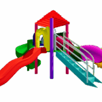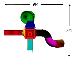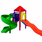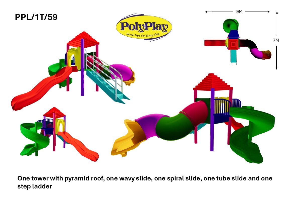 Creative and colorful tower, spiral and wavy slides, a step ladder. A perfect setup for sliding, and imaginative outdoor fun.