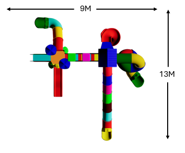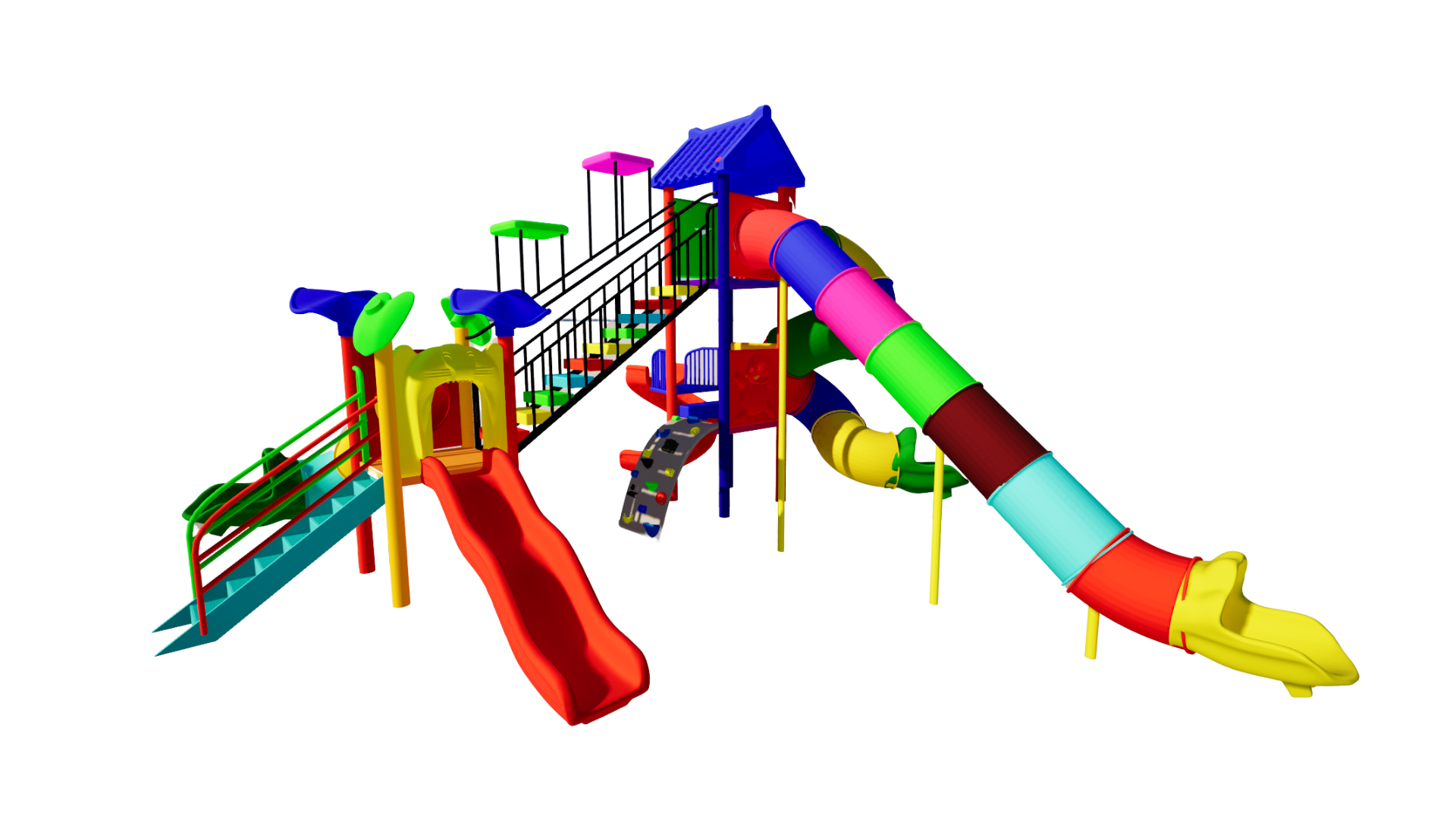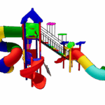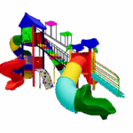 The Polyplay PPL/2T/71 is a two tower (one high and two low tower) with one tiled roof and one leaf top. One wavy slide, one spiral slide, one S-tube slide, one long coil tube slide and one small tube slide. One step bridge, one monkey climber and one step ladder.