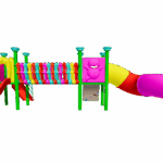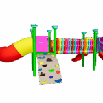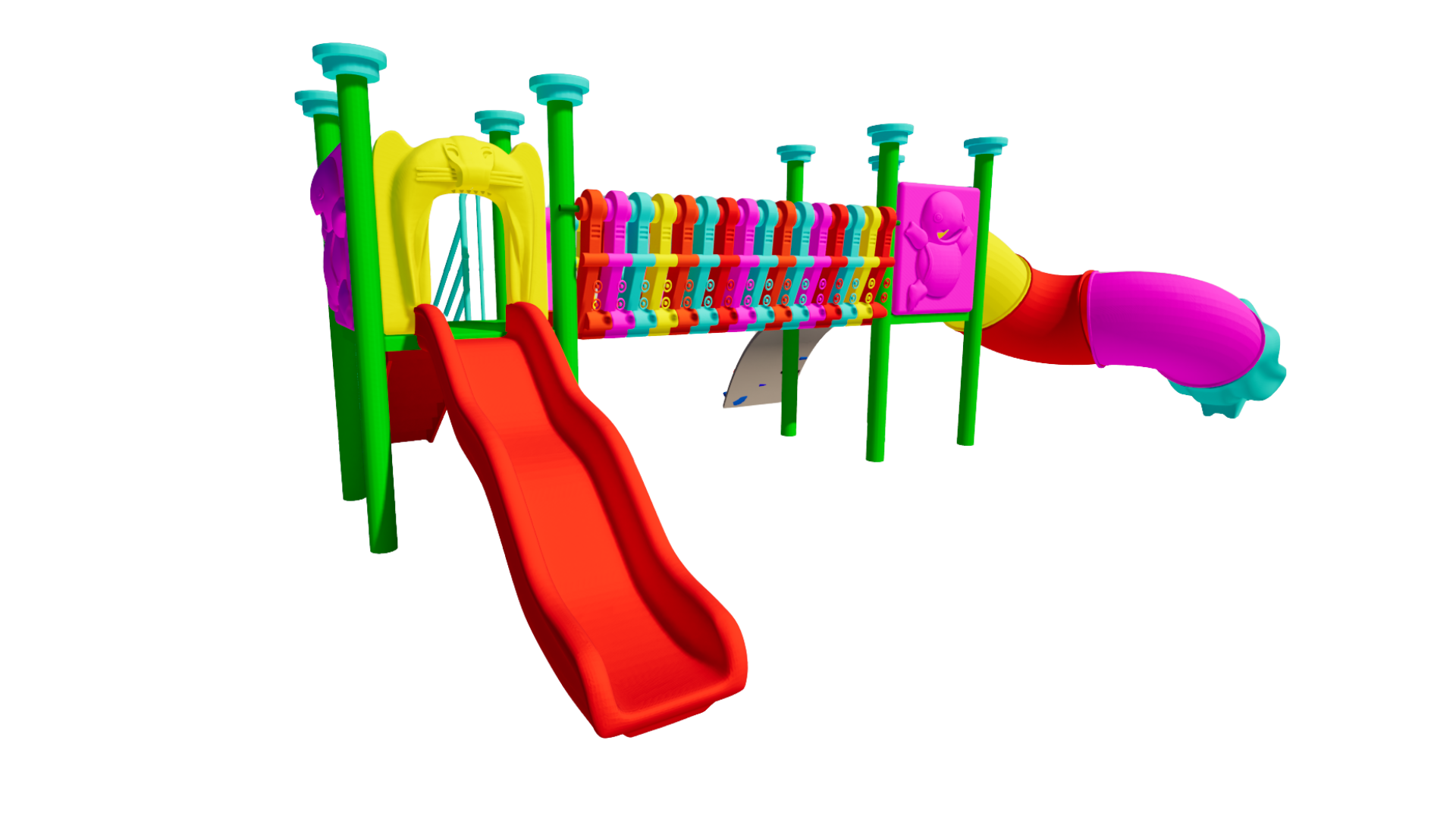 The Polyplay PPL/2T/75 is a two tower no roofs, one tube slide, one monkey climber, one wavy slide, U-bridge and step ladder.