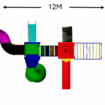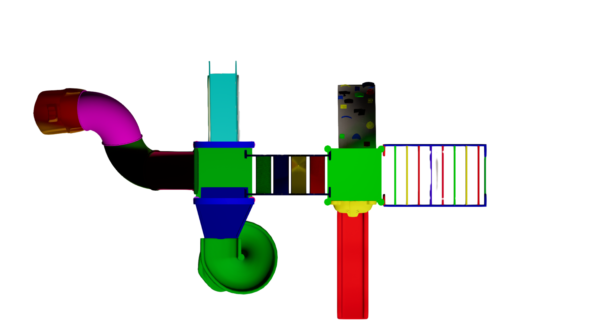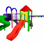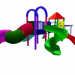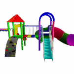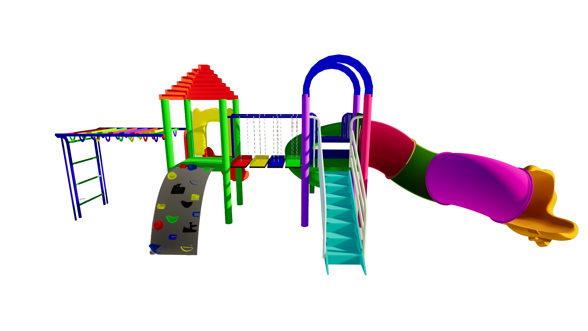 The Polyplay PPL/2T/83 is a two tower roofs with one pyramid roof and one crescent roof, one tube slide, one spiral slide, one wavy slide, one rock climber, one step ladder, one hanging bridge and monkey climber.