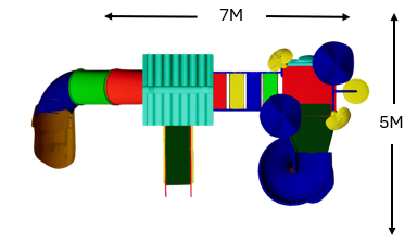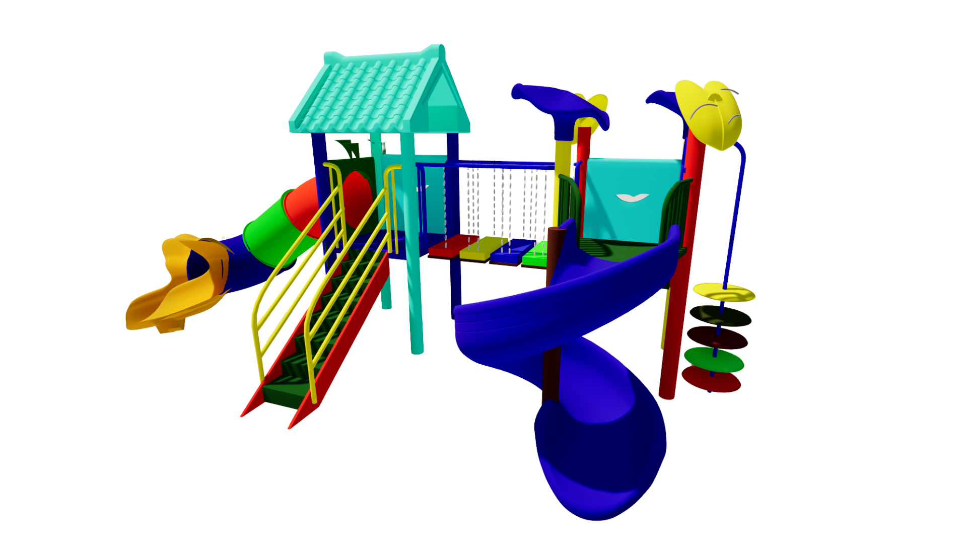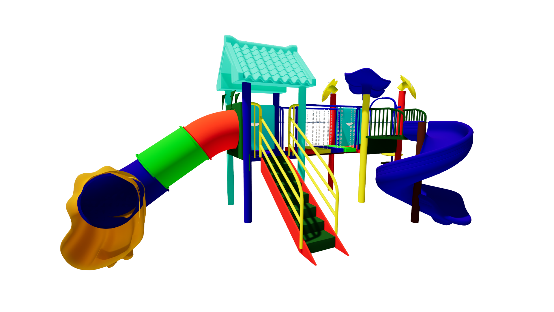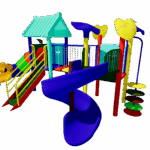 The Polyplay PPL/2T/84 features two tower roofs with one tiled roof, one leaf top roof, one spiral slide, one tube slide, step bridge, disk ladder and one step ladder.