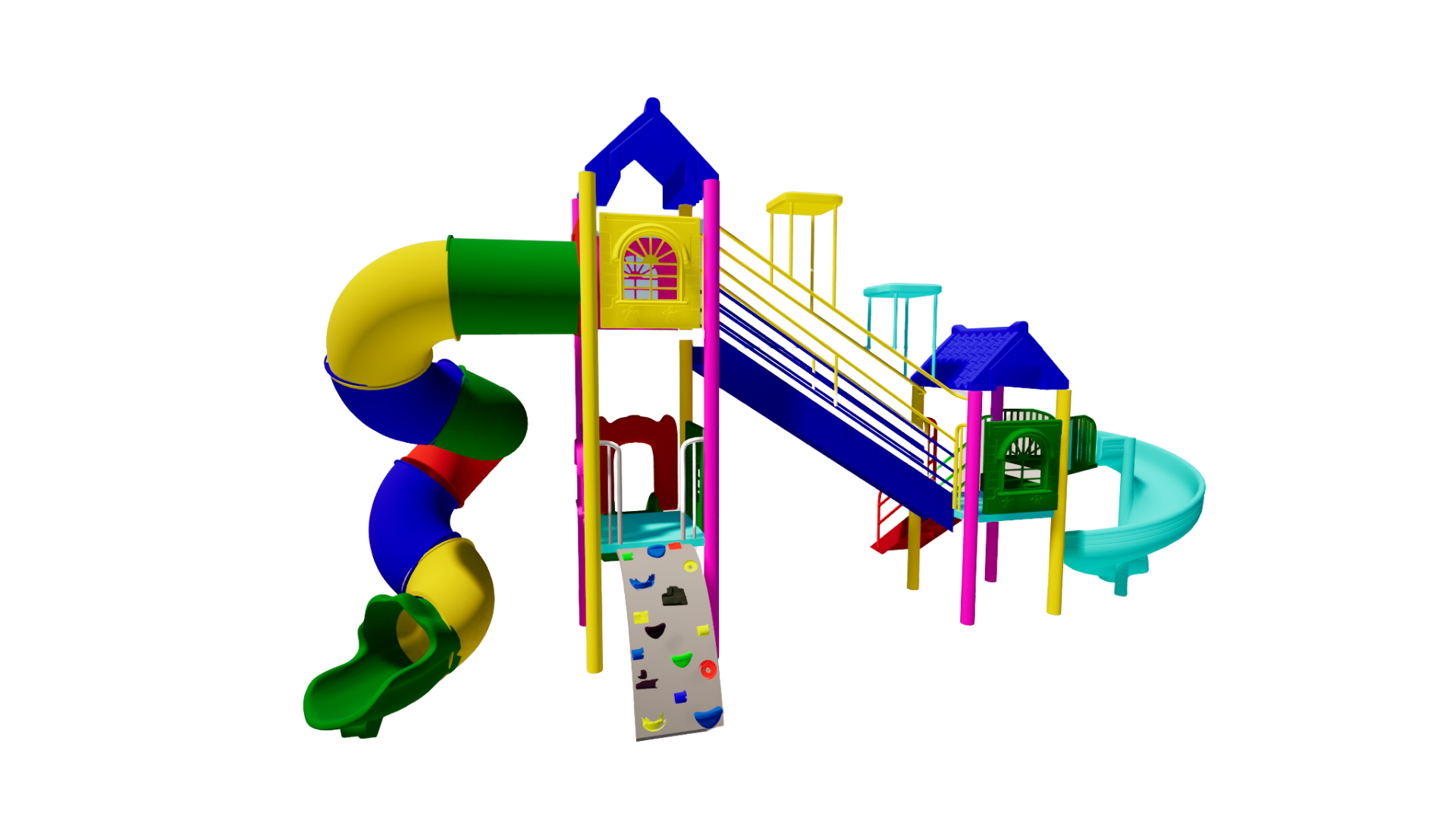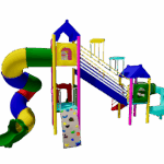 The Polyplay PPL/2T/85 is a two tower roofs with two tiled roofs, one spiral slide, one wavy slide, one long tube slide, one rock climber, one step ladder and one 11-step ladder.