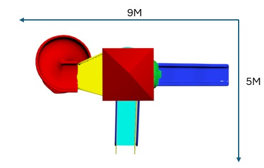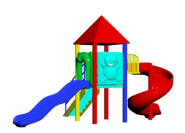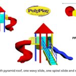 Creative and colorful tower, spiral and wavy slides, a step ladder. A perfect setup for sliding, and imaginative outdoor fun.