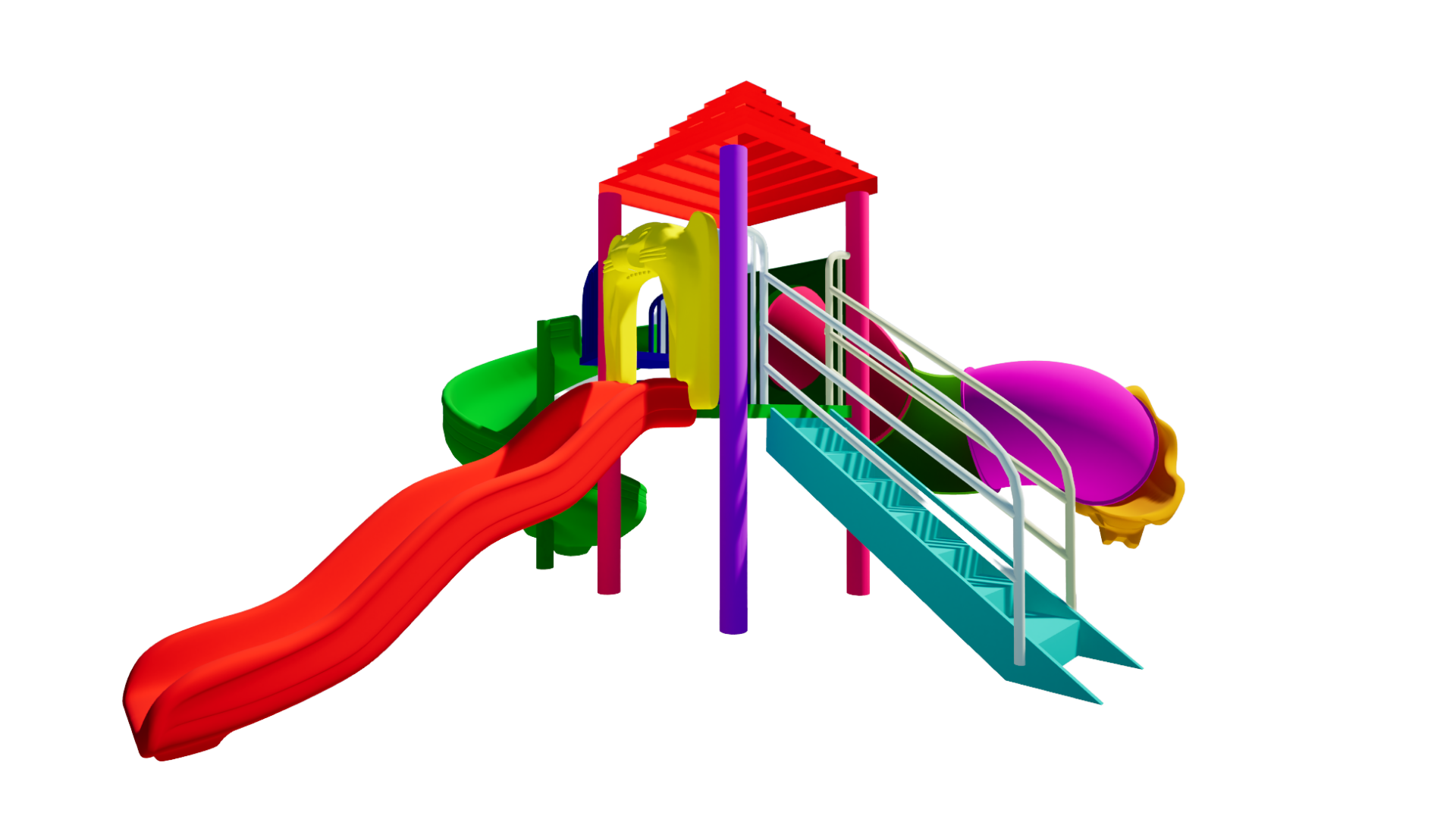 Creative and colorful tower, spiral and wavy slides, a step ladder. A perfect setup for sliding, and imaginative outdoor fun.