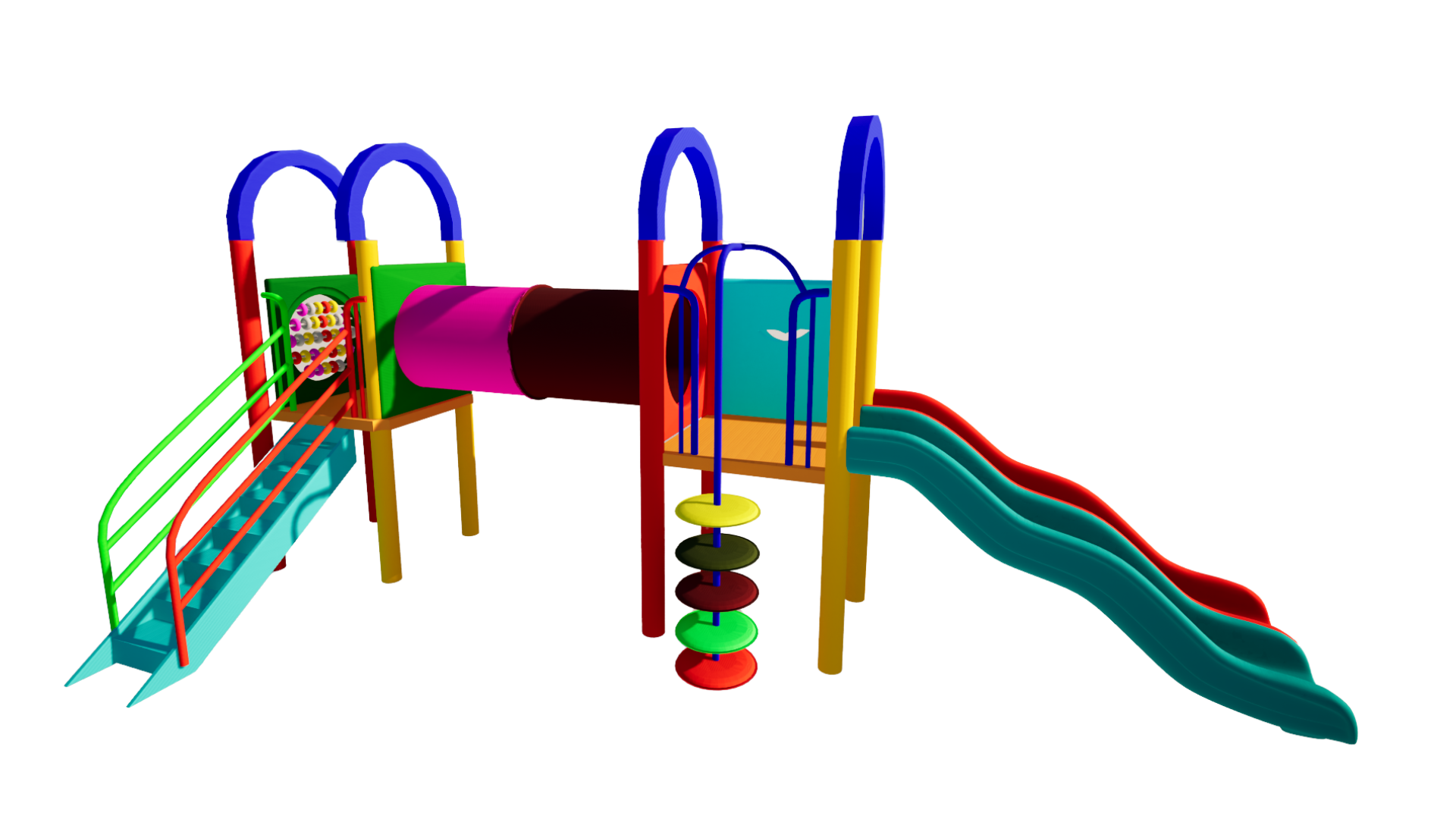 The Polyplay PPL/2T/72 is a two tower with two roofs, two wavy slides, one tunnel bridge, one abacus, one step ladder and one disk ladder.