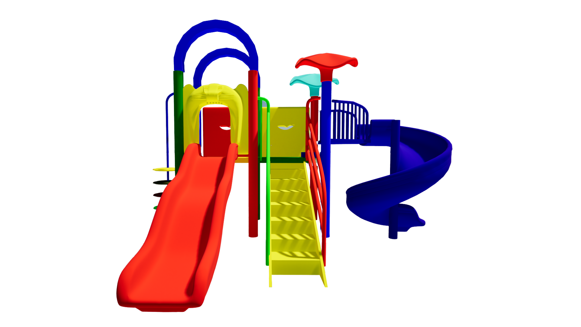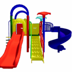 The Polyplay PPL/2T/74 is a two tower with one tree top roof, one crescent roof, one wavy slide, one spiral slide, one step ladder, one disk ladder.