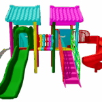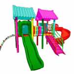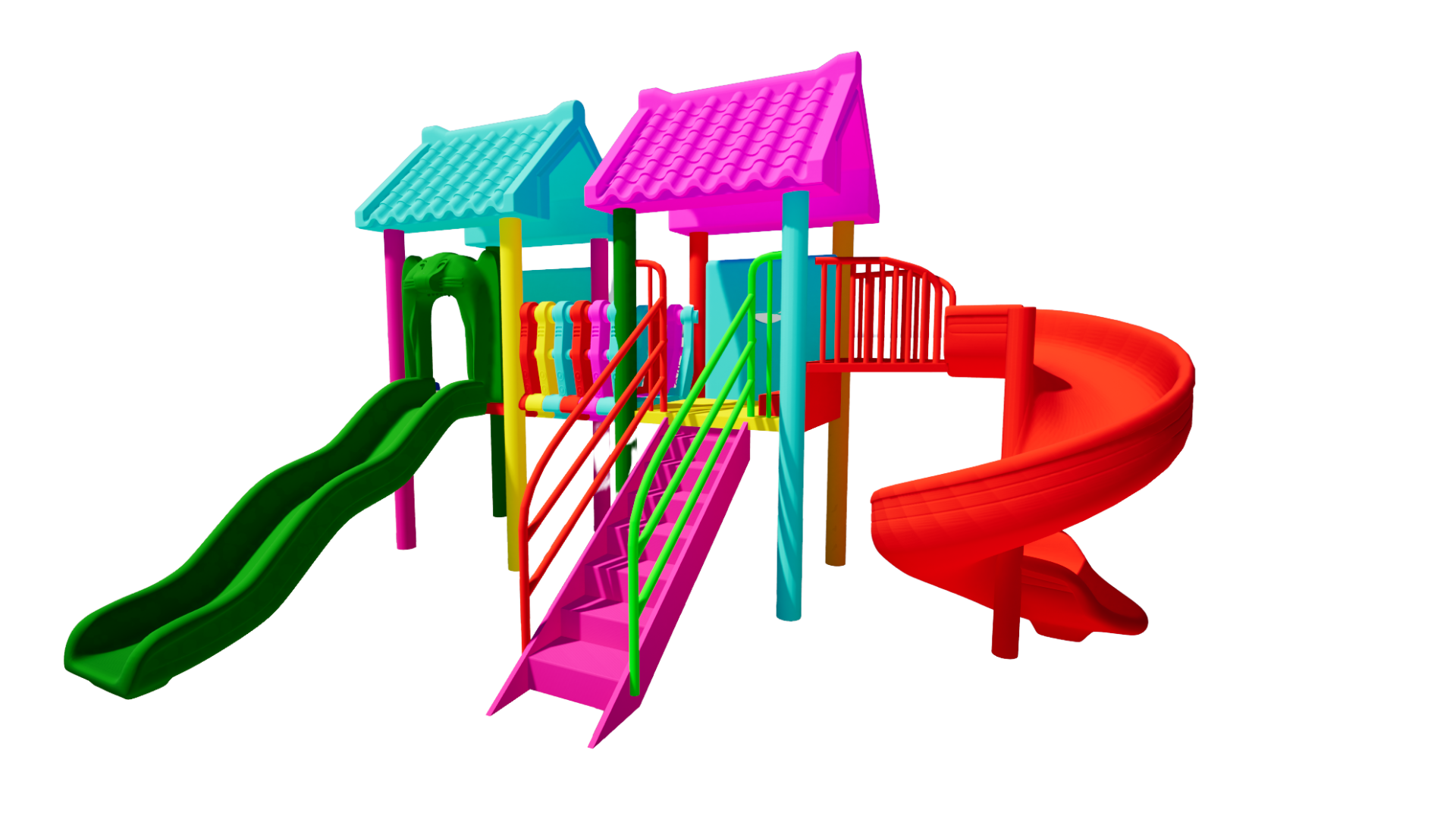 The Polyplay PPL/2T/76 is a two tower roofs with two tiled roofs, one spiral slide, one wavy slide, one rock climber, U-bridge and step ladder.