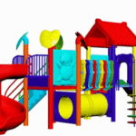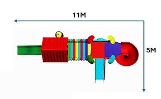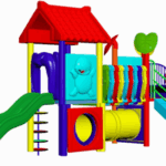 The Polyplay PPL/2T/77 is a two tower with tiled roof and leaf tops, one spiral slide, one wavy slide, one U-bridge, one crawling tube, one disc ladder and step ladder.