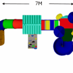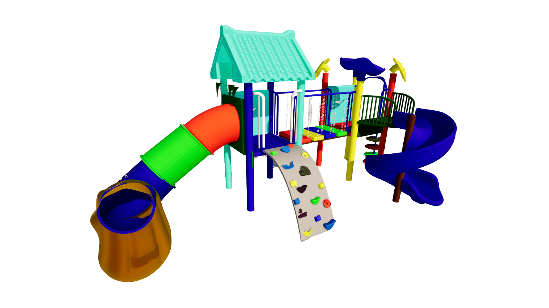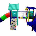 The Polyplay PPL/2T/86 is a sturdy, all-weather playstation features two tower roofs with one tiled roof, one leaf top roof, one spiral slide , one tube slide,1 meter step bridge, disk ladder and one rock climber.