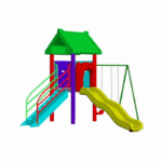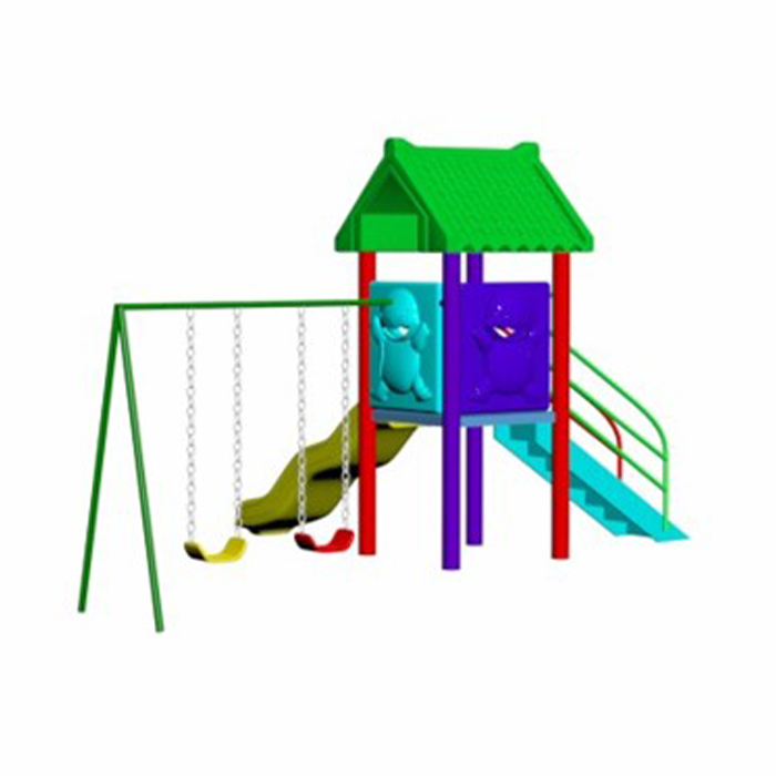 A cheerful play structure featuring a tiled-roof tower, a smooth wavy slide, and a twin swing set. Perfect for shared play and climbing fun in compact outdoor spaces.