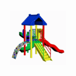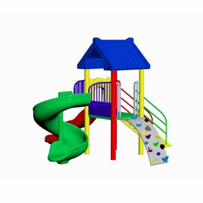 A vibrant playset featuring a tiled-roof tower, fun wavy slide, exciting spiral slide, and adventurous rock climber. Designed to engage kids in active, imaginative play.
