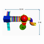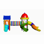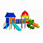 The Polyplay PPL/2T/47 playground, covering an area of 11m x 7m, features two towers with kingkong roofs and leaf tops, offering a bold and nature-inspired design. It includes a wavy slide for a fun, smooth descent, a spiral slide for an exciting twist, and an S-tube slide for a thrilling, enclosed ride. Access to the towers is provided by two step ladders, offering varied climbing experiences. A side baffle with twin swings adds a fun swinging element, while an S-tube tunnel bridge connects the towers, providing an adventurous pathway. This setup ensures a dynamic and engaging play experience.