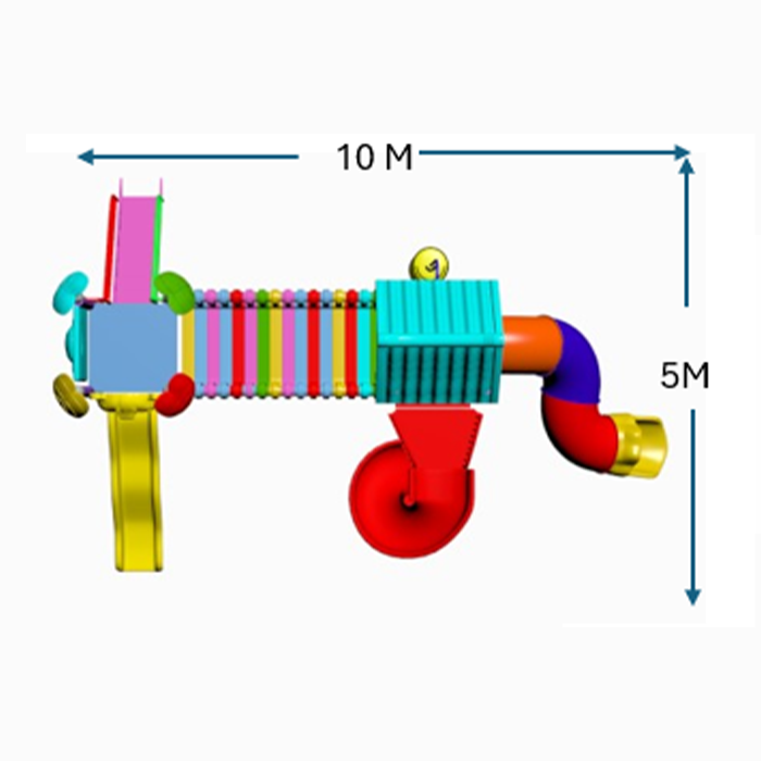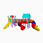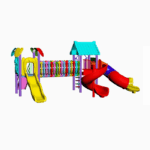 Colorful twin towers with tiled roofs and leaf tops, connected by a band bridge. Features include a tube slide, spiral slide, wavy slide, disk ladder, and step ladder. Designed for climbing, sliding, and active outdoor play, providing endless fun and exploration opportunities for children.
