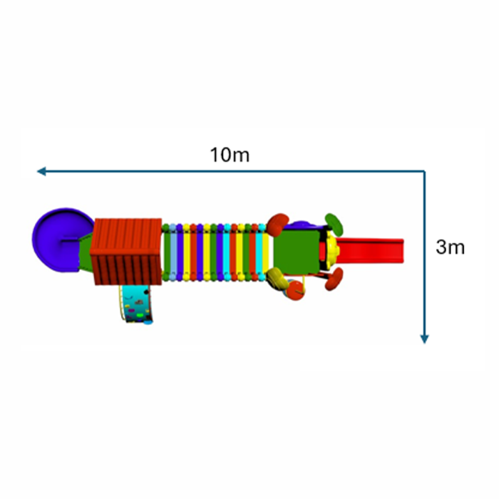 Two towers with tilled roof and leaf tops, one spiral slide, one wavy slide, U-turn bridge, one wall climber with railings and disc ladder