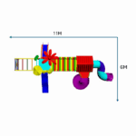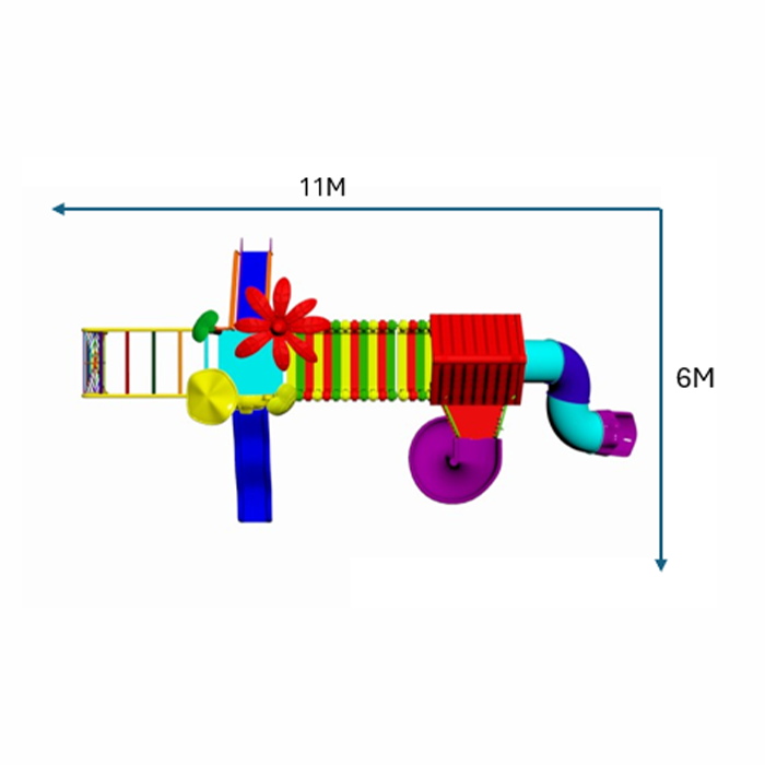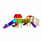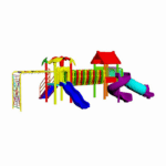 The Polyplay Play Station PPL/2T/61 is an 11M-tall play structure with two towers featuring tiled roofs and leaf tops. It includes a U-bridge, a wavy slide, a spiral slide, and a tube slide for dynamic play. Additional elements like a monkey climber and step ladder enhance physical activity. Ideal for parks or schools, this 6M-wide setup offers fun and adventure for kids.